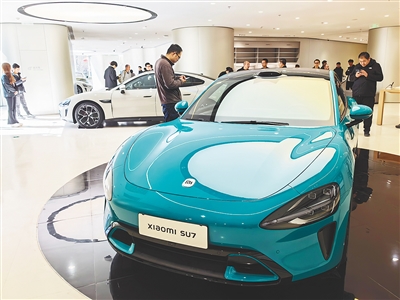 消费者在北京一家小米汽车零售门店内了解小米SU7汽车。新华社发