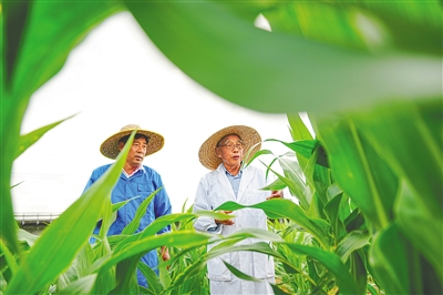 三亚一处南繁基地内,河南省鹤壁市农业科学院玉米育种专家程相文(右)和同事查看授粉期玉米材料的生长情况。(资料图)