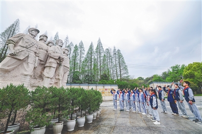 在位于浙江湖州市道场乡的湖州市革命烈士陵园,湖州市吴兴区城南实验学校的学生在革命烈士像前敬礼。新华社发
