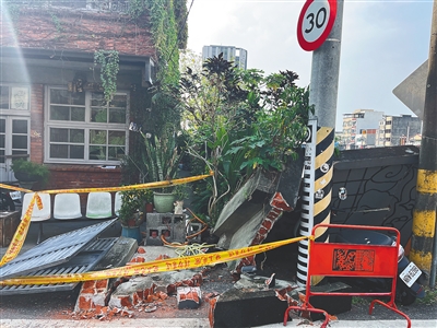 图为4月4日在花莲县花莲市区福建街拍摄的一处房屋,其墙体在前一天的强震中坍塌。 新华社记者 赵博 摄