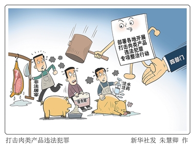 新华社北京4月4日电 国务院食安办、公安部、农业农村部、市场监管总局近日联合印发通知,部署各地开展打击肉类产品违法犯罪专项整治行动。根据通知要求,此次专项整治行动以生猪、肉牛、肉羊、肉鸡及其肉类产品为重点,深挖肉类产品违法犯罪源头线索,对畜禽养殖、屠宰、无害化处理、肉及肉制品生产经营全链条开展专项整治,坚决斩断非法屠宰、加工、销售链条。