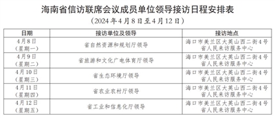 根据日程安排,4月8日至12日,省自然资源和规划厅、省旅游和文化广电体育厅、省生态环境厅、省农业农村厅、省工业和信息化厅相关负责人将在海口市美兰区大英山西二街4号“海南省人民来访服务中心”接访群众。