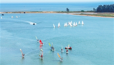 日前,在临高县文澜江入海口,帆影点点。在江面上来回穿行的帆船帆板,成了一道靓丽的风景线。