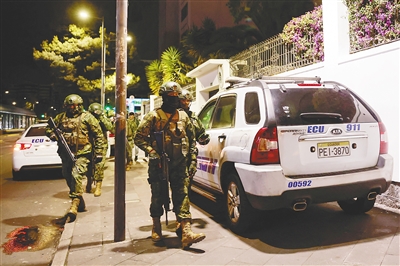 4月5日,在厄瓜多尔基多,厄瓜多尔军人在墨西哥驻厄瓜多尔大使馆外警戒。新华社/路透