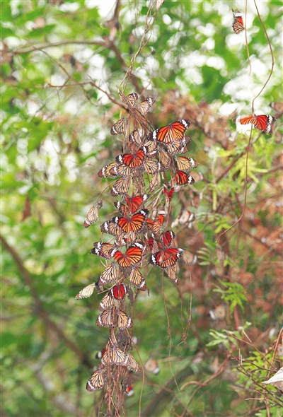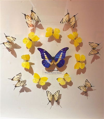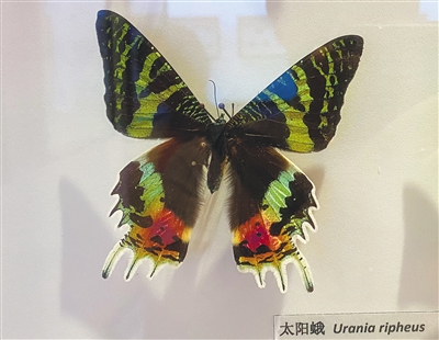 此外,还有来自非洲的长翅德凤蝶,双翅展开达23厘米,是世界上展翅最长的凤蝶;雌雄嵌合体的美凤蝶,令人大开眼界,其生殖腺的一侧是雄性,另一侧是雌性,且外部形态上也表现为一侧符合雄性特征,另外一侧表现为雌性特征,因此,民间称之为“阴阳蝶”。