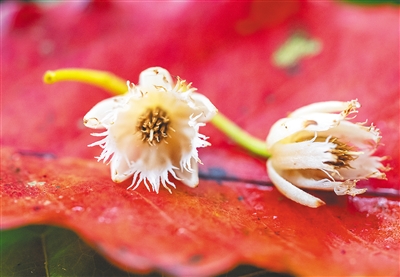 显脉杜英花的花瓣上半部撕裂,裂片多达数十条。
