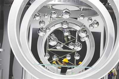 4月8日,第四届消博会主会场,工人在搭建场馆。 本报记者 邱肖帅 摄