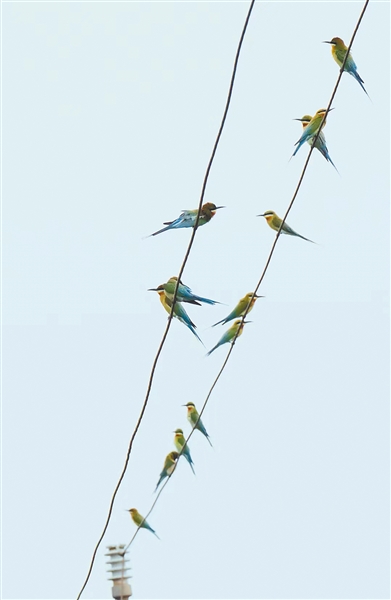 “现在有些鸟还在选址筑巢,等到它们筑巢完成,就开始恋爱、下蛋、孵化,雄鸟就开始忙活,一直到6月底出巢。”澄迈县湿地保护协会监事长王卓介绍,栗喉蜂虎在观鸟族中的“地位”很高,被誉为“中国最美小鸟”,同时也是国家二级保护动物。