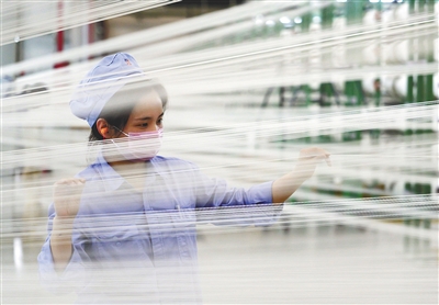⬇工作人员在布机车间检查丝线情况。