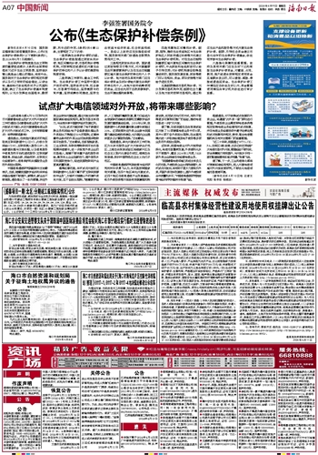 新华社北京4月10日电  国务院总理李强日前签署国务院令,公布《生态保护补偿条例》(以下简称《条例》),自2024年6月1日起施行。