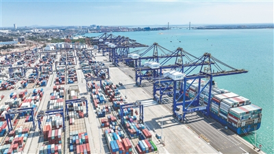 近日,集装箱货轮在洋浦国际集装箱码头装卸货物。随着海南自贸港建设的推进,洋浦港内外贸航线不断加密,该码头已连续4年实现单日集装箱吞吐量历史突破。本报记者 陈元才 摄
