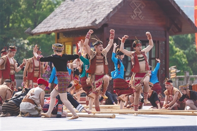4月11日,祭祀袍隆扣大典在五指山市水满乡黎峒文化园举行。图为打柴舞表演。本报记者 李天平 摄