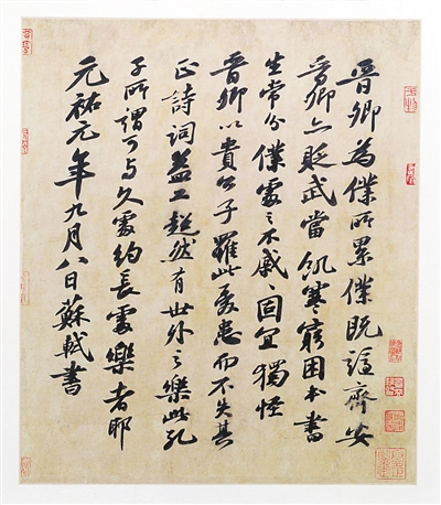 回京第二年,苏轼应王诜之邀,为其在贬谪至武当时所作诗集题跋,写下《题王诜诗词帖》:“晋卿为仆所累,仆既谪齐安,晋卿亦贬武当。饥寒穷困,本书生常分,仆处之不戚戚。固宜。独怪晋卿以贵公子罹此忧患而不失其正,诗词益工,超然有世外之乐。此孔子所谓可与久处约,长处乐者耶。元祐元年九月八日苏轼书。”