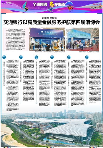 第四届消博会采取“1+3”全岛办展新模式,对金融服务提出了更高要求。交通银行在海南全省范围内持续推进支付服务场景优化建设,通过优化外卡受理、完善现金供给、提升ATM供钞环境、开展数币体验活动等举措,全力做好第四届消博会期间支付服务支撑工作。
