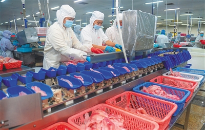 位于澄迈的海南翔泰渔业股份有限公司,工人对海南鲷进行加工包装。 阮琛 摄