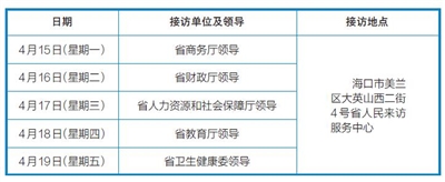 根据日程安排,4月15日至19日,省商务厅、省财政厅、省人力资源和社会保障厅、省教育厅、省卫生健康委相关负责人将在海口市美兰区大英山西二街4号“海南省人民来访服务中心”接访群众。