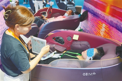 消费者在养生新科技按摩椅体验。