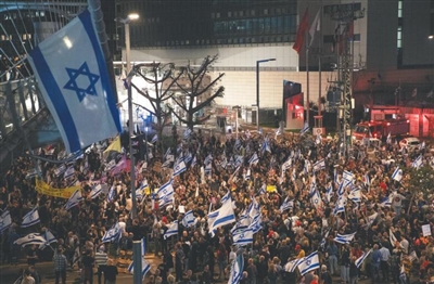 4月13日晚,在以色列特拉维夫的以色列国防部前,民众在安全警告生效前举行示威集会。新华社发