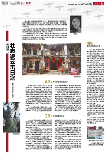 ■ 海南日报记者 张期望陵水黎族自治县椰林镇解放巷13号,一座砖瓦结构的两层老宅静静伫立,斑驳的墙壁显示它建设年代久远。这座老宅的客厅里,悬挂着一张大幅画像,画像上身穿空军服站在飞机前的男子,名叫莫同淅,是一名在抗战中为国捐躯的航空英烈。