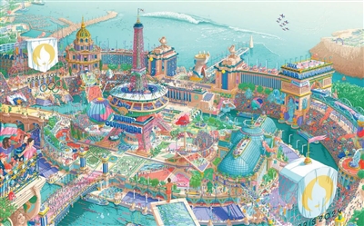 法国巴黎奥运海报以绚烂丰富的绘画细节为世界各国观众呈现出一幅塞纳河畔的建筑奥林匹克盛宴。