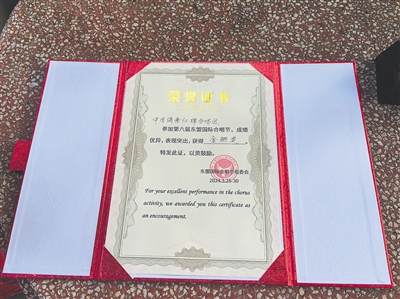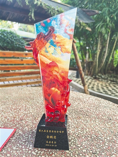 3月30日,海南红棉合唱团摘得第六届东盟国际合唱节金鹏奖,图为奖杯和荣誉证书。