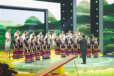 海南红棉合唱团在央视《歌声与微笑》栏目录制现场演唱黎族民歌《斗牛调》。王亦晴 摄