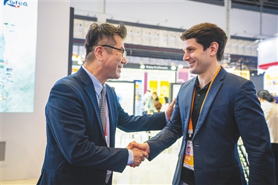 两位参展嘉宾在亲切握手。 本报记者 袁琛 摄