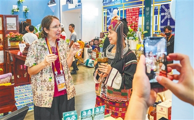4月14日,消博会海南国货潮品馆,外国人谢敏在推销自己设计的产品,她在海口经营文创产品商店已经多年。 本报记者 陈元才 摄