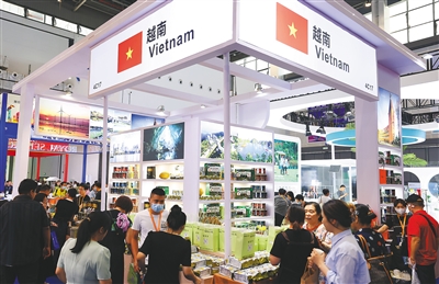 四月十六日,观众在第四届消博会上了解越南展品。本届消博会上,共建“一带一路”国家的企业积极参展,涵盖食品、服饰、家居生活等消费领域。新华社记者 杨冠宇 摄