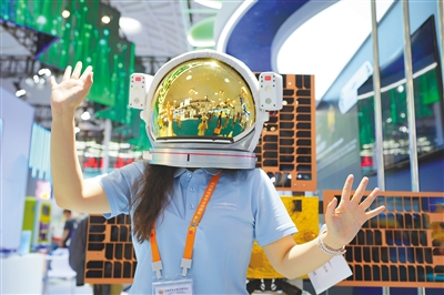 在第四届消博会国货特色潮品展区,一名参会者戴上“太空盔”体验360度俯瞰地球全景影像。 本报记者 张茂 摄