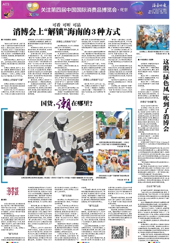 “消博会是向世界展示绿色低碳消费新风尚的窗口。”海南国际经济发展局有关负责人说,依托消博会这一绿色消费创新试验地,更多海内外参展企业将加快转型,推动实现绿色发展。