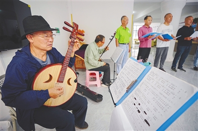 在三亚崖州区南滨居老年人日间照料中心,老年朋友们在练习合唱。