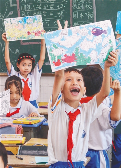 去年,“有趣的海洋”科普课堂走进三亚市天涯小学,学生们用画笔画出自己心目中的海洋。