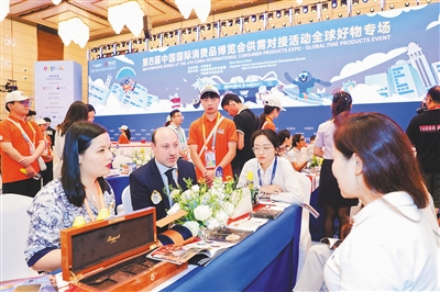 国内外展商在中国银行主办的跨境撮合会全球好物专场上洽谈合作。
