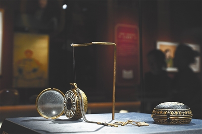 展览中的故宫博物院藏铜镀金壳开光人物像怀表。新华社发