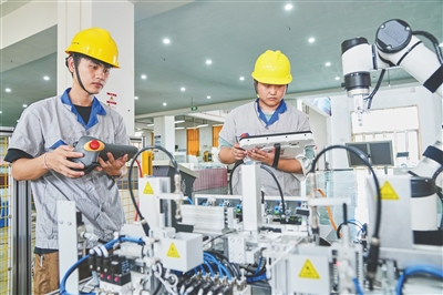 近日,在海南科技职业大学机电工程学院工业机器人技术实训室里,学生正在开展实操练习。