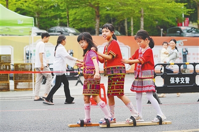 2024年海南黎族苗族传统节日“三月三”主会场活动中,小朋友们体验板鞋竞速体育项目。