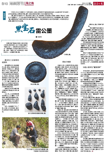 约在十世纪初叶的五代初年,刘恂在《岭表录》(即《岭表录异》)中记载:“雷州之西雷公庙,百姓每岁配连鼓雷车……每大雷雨后,多于野中得黳石,谓之雷公墨。叩之鈖然,光莹如漆。又如霹雳处,或土木中,得楔如斧者,谓之霹雳楔……”详细记述雷州盛产斧楔状雷公墨——“霹雳楔”。