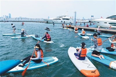 近日,140多名运动爱好者在海口体验桨板运动,拉开了椰城夏日水上运动序幕。图为海口华彩杰鹏游艇会码头内,体验者感受桨板运动的魅力。