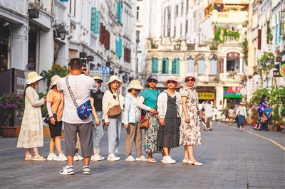 近日,不少市民游客来到海口骑楼建筑历史文化街区,用手机或相机定格骑楼老街之美。海口骑楼建筑历史文化街区是海口市近五年来首次新增的国家4A级旅游景区。作为海口地标性建筑,其独特的南洋建筑风格和深厚的历史文化底蕴,在国内外享有较高的知名度和美誉度,是游客了解南洋文化的一扇重要窗口。本报记者 李天平 摄