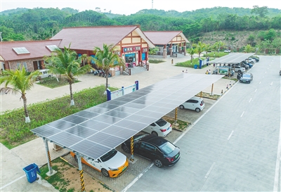 近日,航拍海南中线高速公路琼中服务区,该服务区安装的停车棚兼具发电功能。