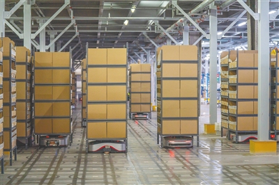 近日,在海南澄迈京东智能产业园亚洲一号厂房内,“地狼”搬运机器人在搬运货物。 本报记者 袁琛 摄