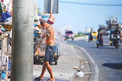 图为4月26日,在菲律宾马尼拉,一名男子将水倒在身上降温。新华社/美联