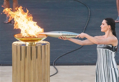 4月26日,扮演最高女祭司的希腊女演员玛丽·米娜用火盆中的火点燃奥运火炬。新华社发