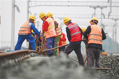 5月1日,中铁八局的建设者在位于贵州省贵安新区的贵南高铁引入贵阳枢纽工程现场进行铺轨施工。