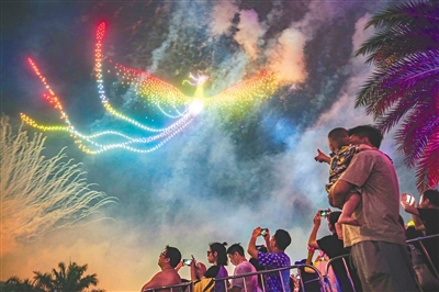 现场数千架无人机腾跃夜空,配合礼花、声音、影像、灯光等,创造出极具震撼力的视听效果。