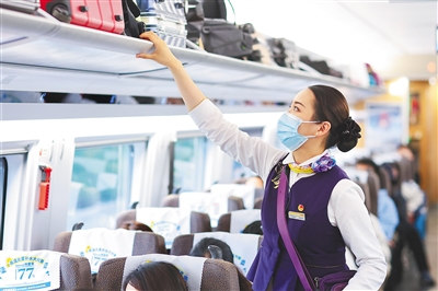5月4日,在南京开往赣榆的C3103次列车上,青年列车员在车厢内整理行李架。