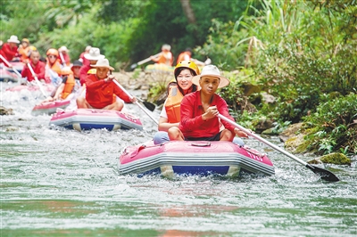 5月4日,游客在位于广西靖西市的古龙山峡谷群风景区漂流。