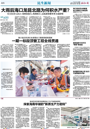 为解决内涝问题,海口按照“南蓄、中疏、北排”的基本思路,优化排水分区。2023年,海口印发《海口市内涝治理三年行动计划》,分三个批次对主城区积水点逐个研究制定具体解决方案,主要包括龙华路、海港路北段、龙昆沟下游段、鸭尾溪排涝泵站、美舍河、义龙路、观澜湖北区、丘海延长线、滨海大道、海南大学等重点路段。截至目前,海口已完成积水点改造项目5个,正在开工建设积水点改造项目10个。