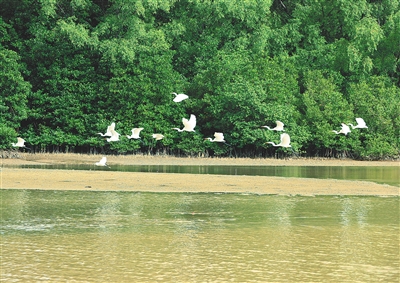 三亚市河东路亲水平台,成群的白鹭在飞舞、觅食。 本报记者 武威 摄